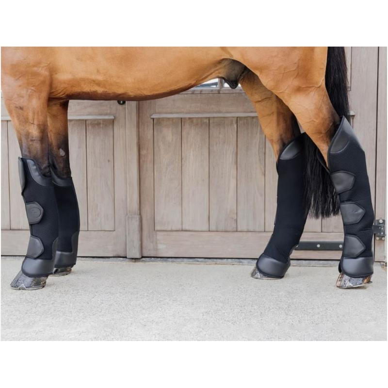 Ochraniacze firmy Waldhausen. Dobrze amortyzują wstrzasy oraz uderzenia, jednocześnie dzięki wykonianiu z siateczki są niesamowicie oddychające. Możliwość regulacji w trzech miejscach za pomocą praktycznych i szybkich w użyciu zapięć na kołki z elastycznymi wstawkami. Pozwala to na jeszcze lepsze dopasowanie do nogi konia.