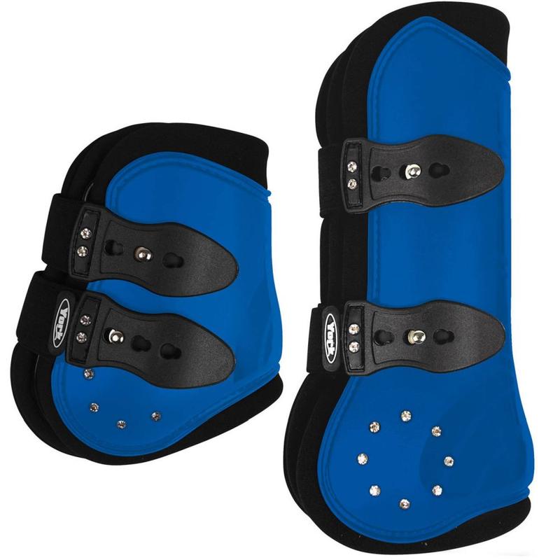 Ochraniacze Vena firmy York. Wyposażone w elastyczne paski oraz zapięcia na kołki. Wykonane z elastycznego tworzywa, podszytego miękkim materiałem. Bardzo dobrze dopasowują się do kształtu nóg. W komplecie 4 szt. Znakomita ochrona przednich i tylnych nóg konia.