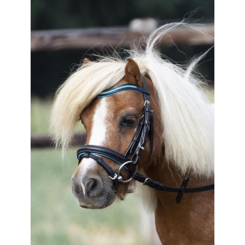 Ładne i solidnie wykonane skórzana ogłowie firmy Busse. Z kolorowo podłożonym nachrapnikiem i pałąkiem. To ogłowie dla małych kucyków rasy Mini-Shetty i Shetty. Ukoronkowany nachrapnik, zakrzywiony naczółek w komplecie razem z wodzami parcianymi.