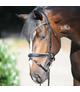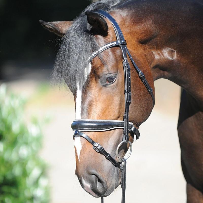 Ogłowie Charlotte marki Kavalkade ze szwedzkim nachrapnikiem. Wykonane z wysokiej jakości niemieckiej skóry. Nachrapnik i pasek potyliczny miękko podszyte. Opadający naczółek ozdobiony dużymi, białymi kryształkami.