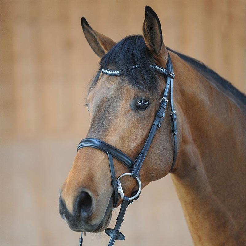Ogłowie Diana firmy Kavalkade z wykonane z wysokiej jakości niemieckiej skóry o anatomicznym kształcie. Posiada nachrapnik typu szwedzkiego oraz specjalny pasek mocujący zapewniający jednocześnie swobodę oddechu. Część potyliczna i nachrapnik miękko wyścielone. Ozdobiony na opadającym naczółku białymi kryształkami. W zestawie gumowe wodze.