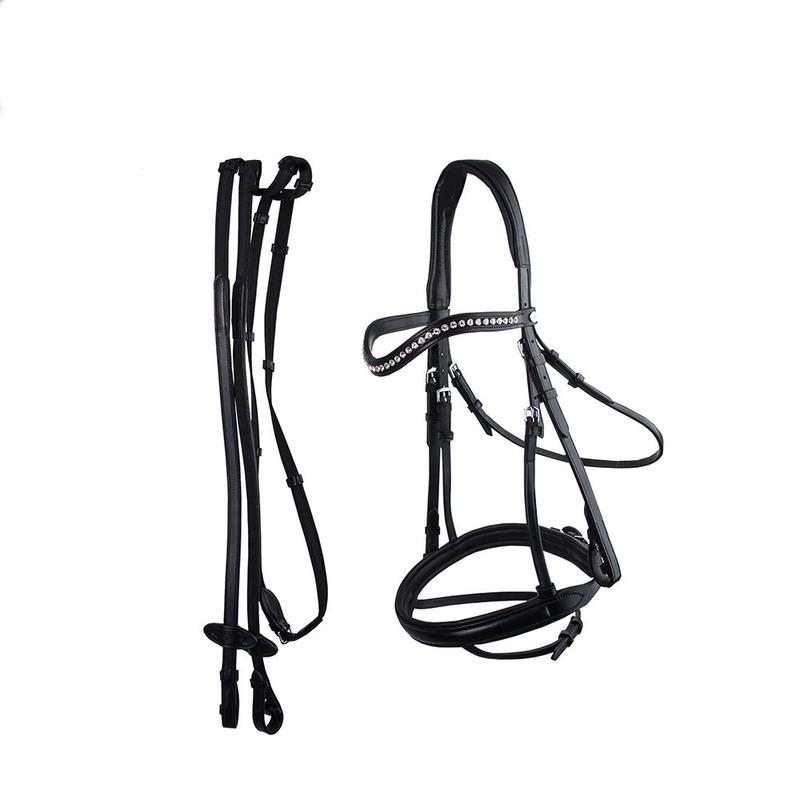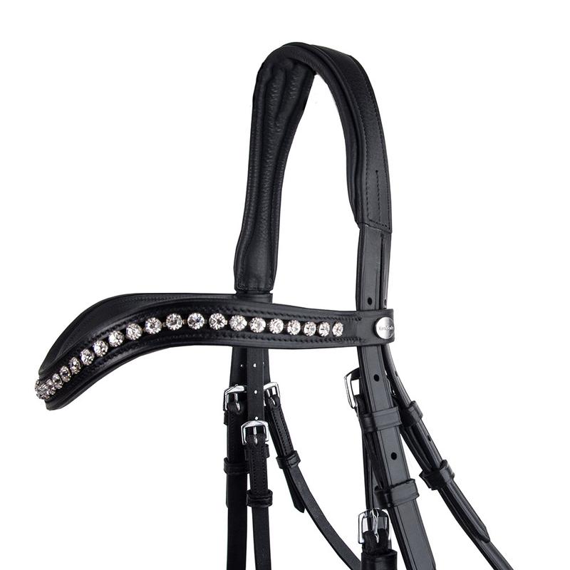 Ogłowie Diana firmy Kavalkade z wykonane z wysokiej jakości niemieckiej skóry o anatomicznym kształcie. Posiada pasek mocujący zapewniający jednocześnie swobodę oddechu. Ozdobiony na opadającym naczółku białymi kryształkami. W zestawie skórzane wodze.