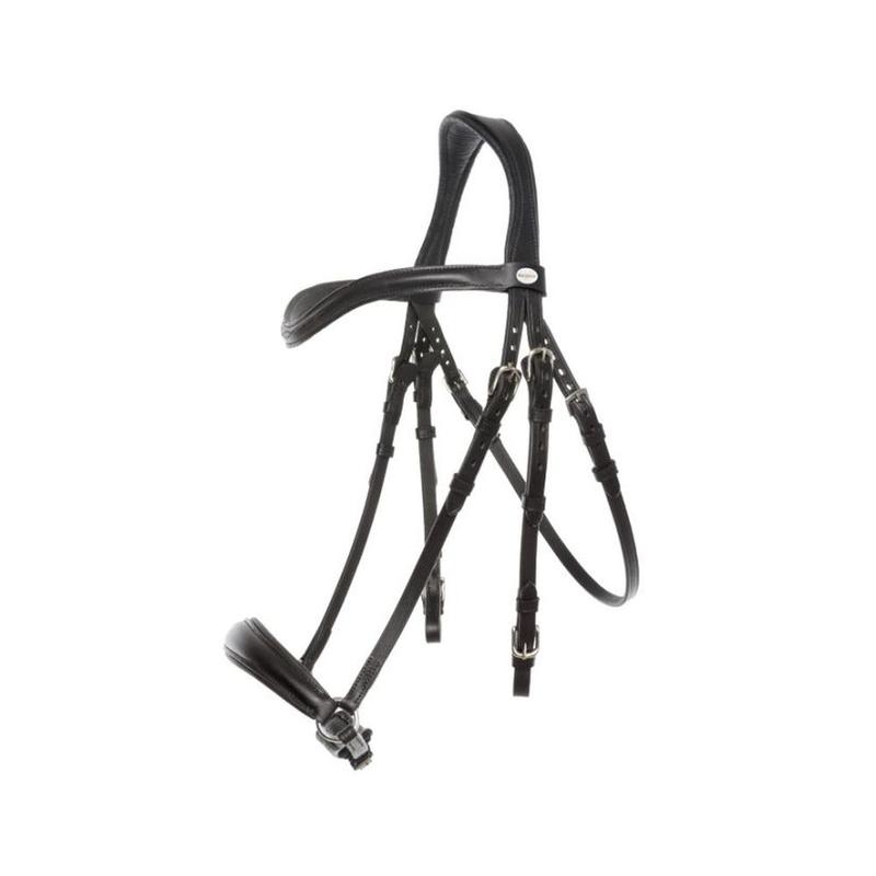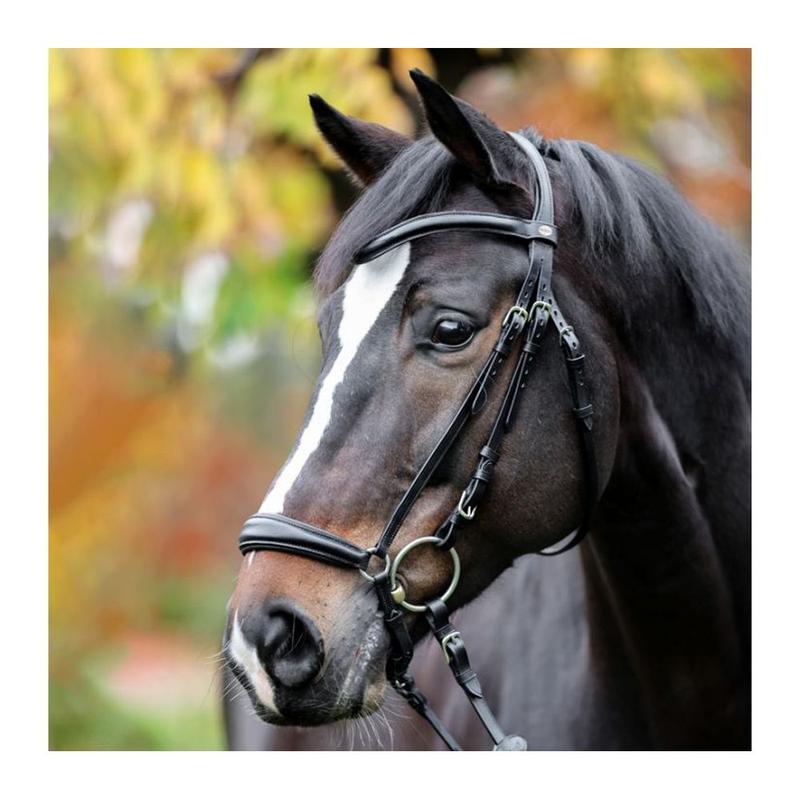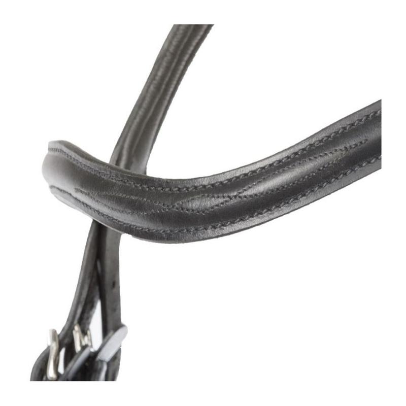 Ogłowie firmy Kavalkade. Lekko natłuszczona europejska skóra, większe klamry i owalne otwory ułatwiające zapinanie oraz zakrzywiony skórzany pałąk z ozdobnym haftem w tym samym kolorze. Skórzane paski pod klamrami zapewniają dodatkowy komfort dla konia. Materiał: 100% skóra