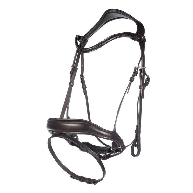 Ogłowie firmy Horze. Skórzane ogłowie, anatomicznie ukształtowany nagłówek. Miękkie skórzane podszycie na nachrapniku i potylicy. Podniesiony prosty naczółek. Szeroki nachrapnik crank z przymocowanym paskiem. Nachrapnik odpinany z obu stron. Wodze nie wchodzą w skład zestawu.Opis techniczny:100% skóra.