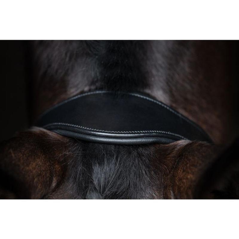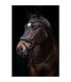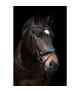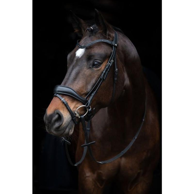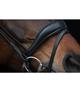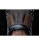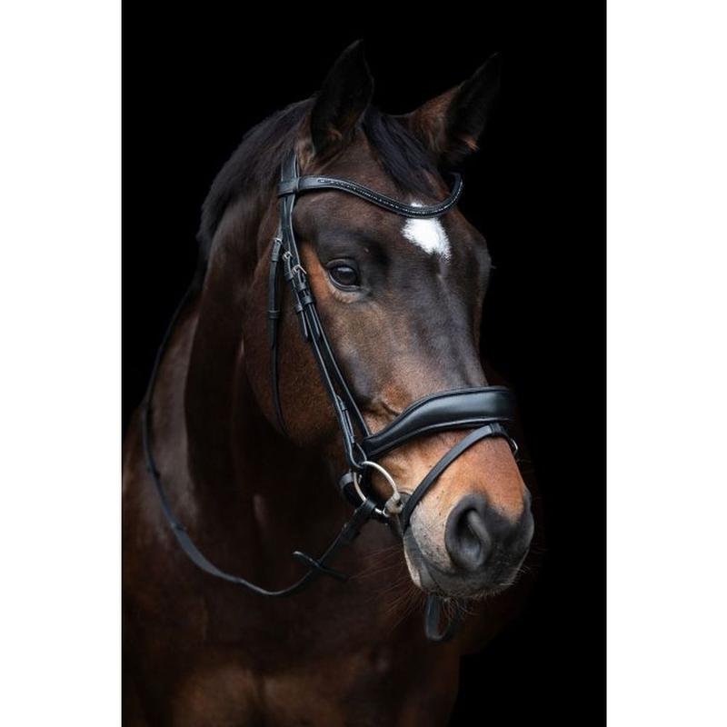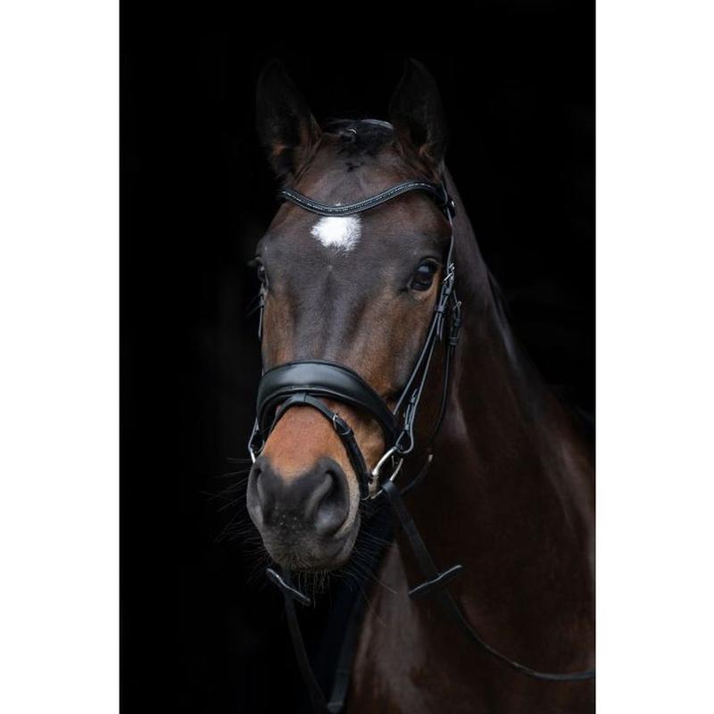 Ogłowie Ira firmy HKM. Wykonane ze miękkiej naturalnej skóry bydlęcej. Wyposażone w wyściełany nachrapnik, odpinane wodze, miękko wyściełany nagłówek, oraz pasek pod szyję regulowany po obu stronach. Naczułek ozdobione kryształkami, który można odpiąć za pomocą zatrzasków.
