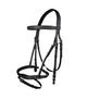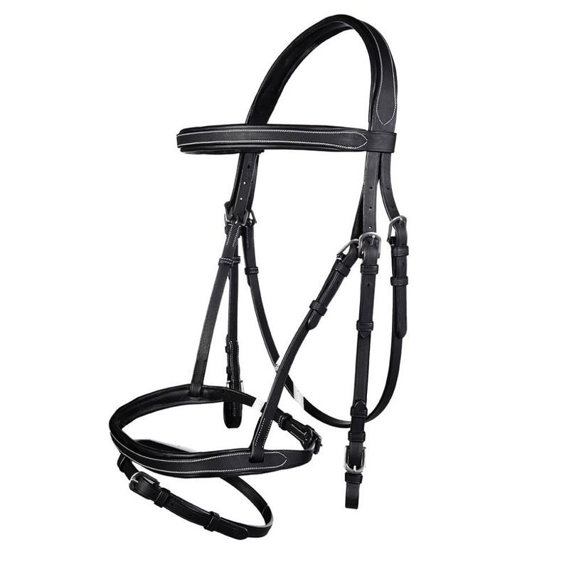 Ogłowie Judith z nachrapnikiem angielskim firmy HKM. Wykonany z wysokiej jakości skóry naturalnej, zdobione białą nicią na naczółku i nachrapniku. Bardzo wytrzymałe, odporne na warunki atmosferyczne i wilgoć. Naczółek podszyty miękkim materiałem. Wyposażo