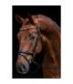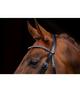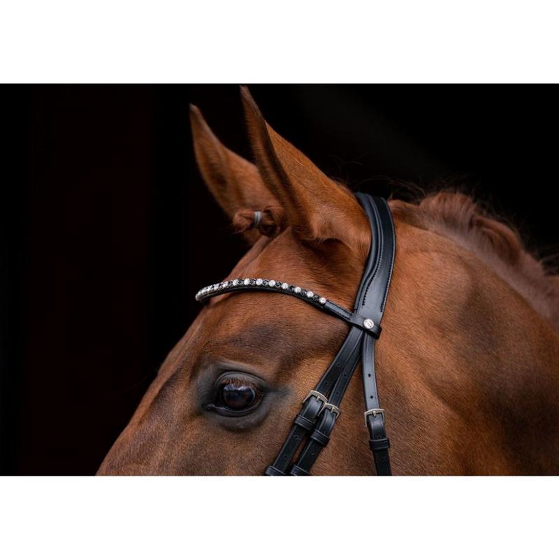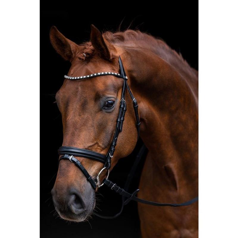 Ogłowie firmy HKM Maila. Wykonane z wysokiej jakości skóry z podszytą częścią nosową i potyliczną. Nachrapnik typu angielskiego. W komplecie z wodzami.