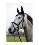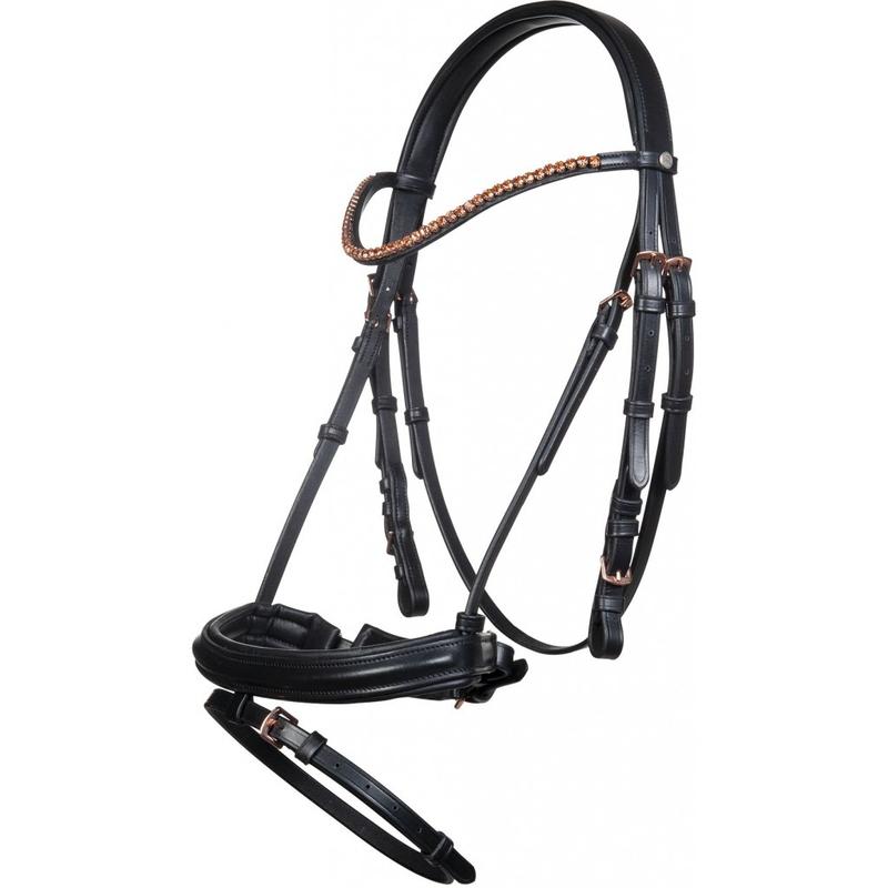 Ogłowie z nachrapnikiem angielskim HKM Rosegold Glamour. Wykonane z wysokiej jakości skóry z miękkim podszyciem na części potylicznej oraz nachrapniku. Ozdobione cyrkoniami. Okucia wykonane w kolorze złotym. W komplecie wodze parciane.