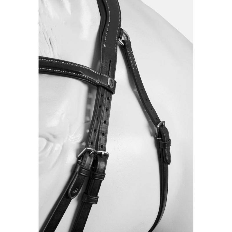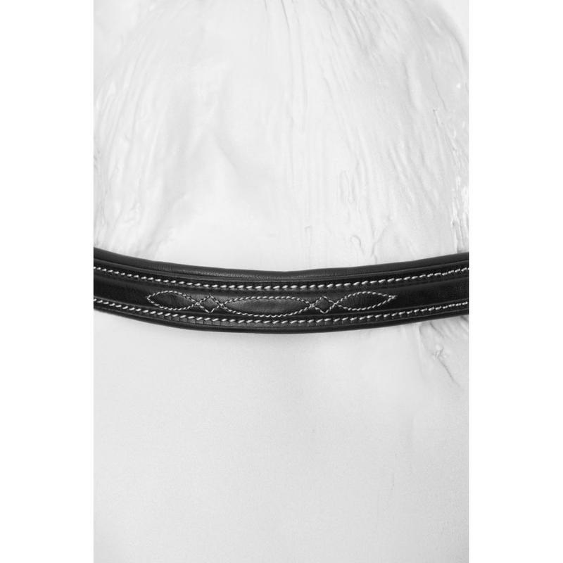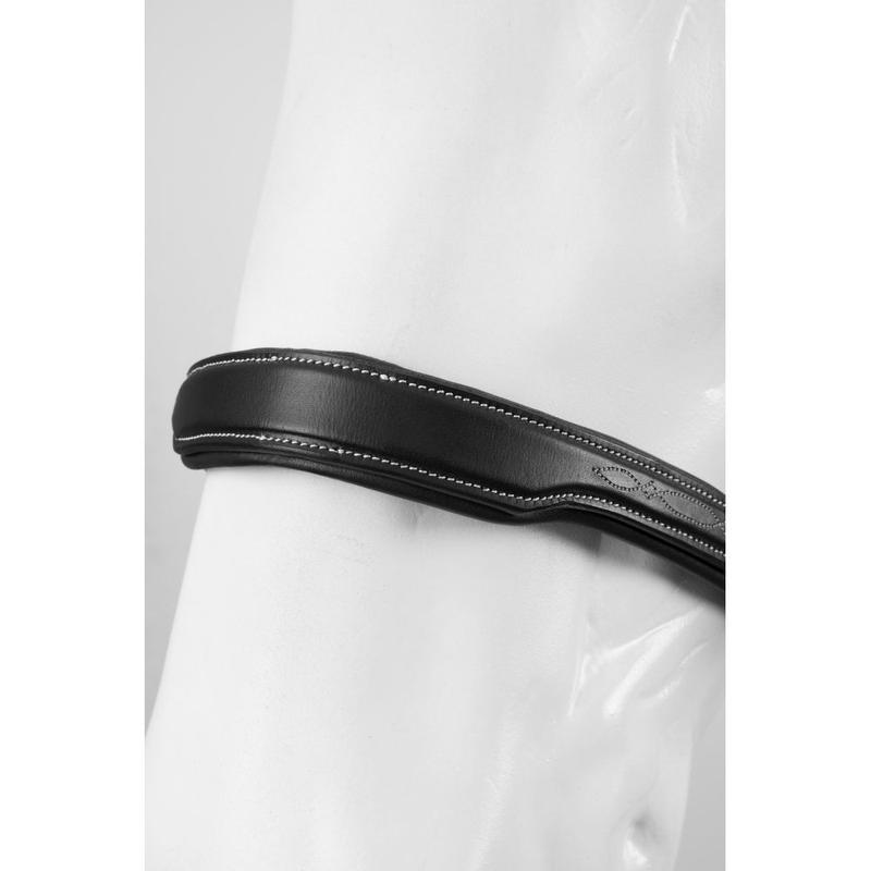 Anatomiczny nachrapnik z miękką skórzaną wyściółką. Z odpinanym skośnikiem. Karabińczyki na paskach policzkowych do przypięcia wędzidła