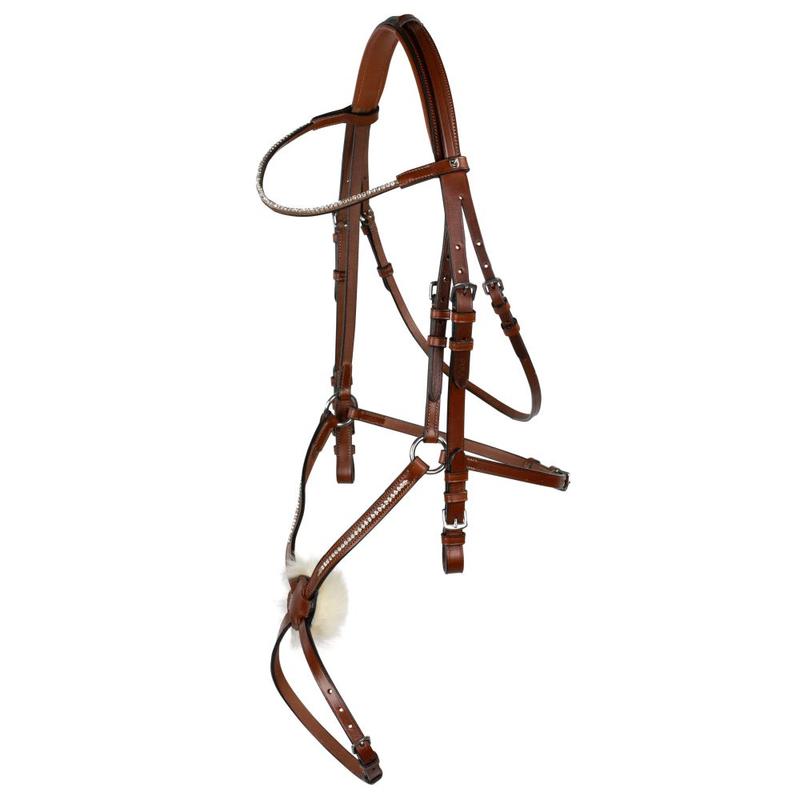 Ogłowie Valencia Mexican firmy Horze. Wykonane z miękkiej skóry przyozdobionej cyrkoniami. Posiada miękko podszyty nachrapnik oraz elegancki naczółek.