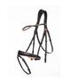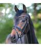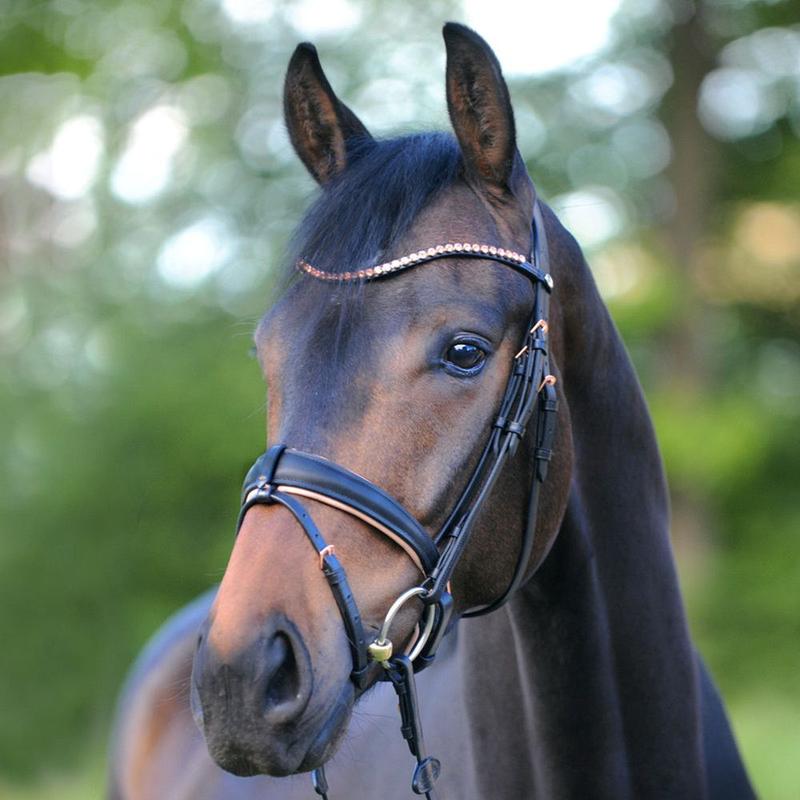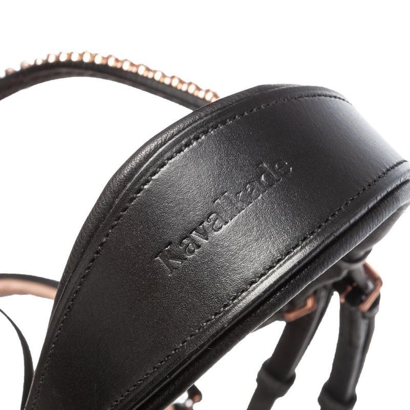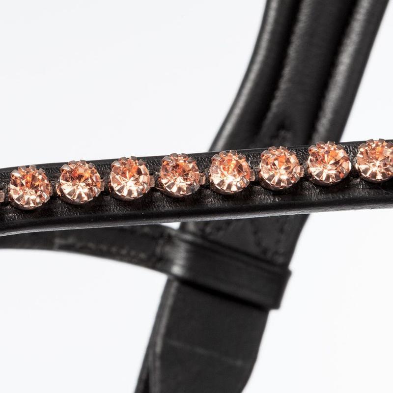 Ogłowie firmy Kavalkade. Posiada nachrapnik oraz pasek potyliczny miękko podszyty skórą w kolorze jasnego różu. Naczółek opadający, ozdobiony kryształkami w kolorze różowego złota. Skośnik oraz szlufka całkowicie wypinane. Posiadają w komplecie antypoślizgowe wodze.