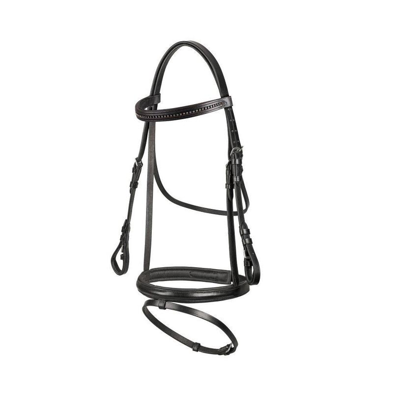 Ogłowie munsztukowe Antonia firmy Kavalkade. Miękko podszyte. Naczółek ozdobiony kryształkami. W zestawie znajdują się wodze.