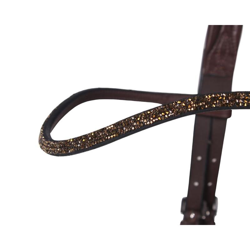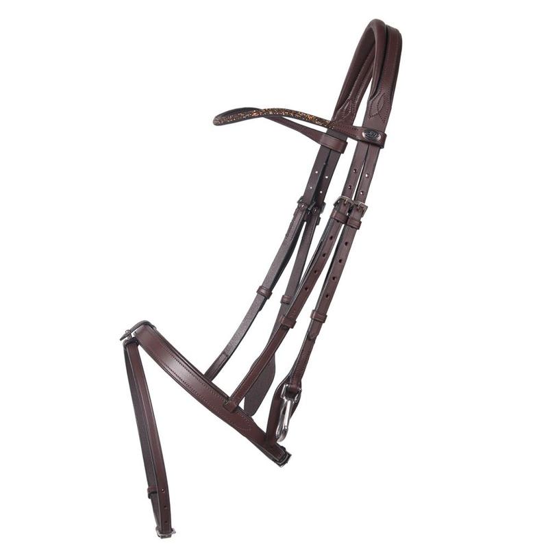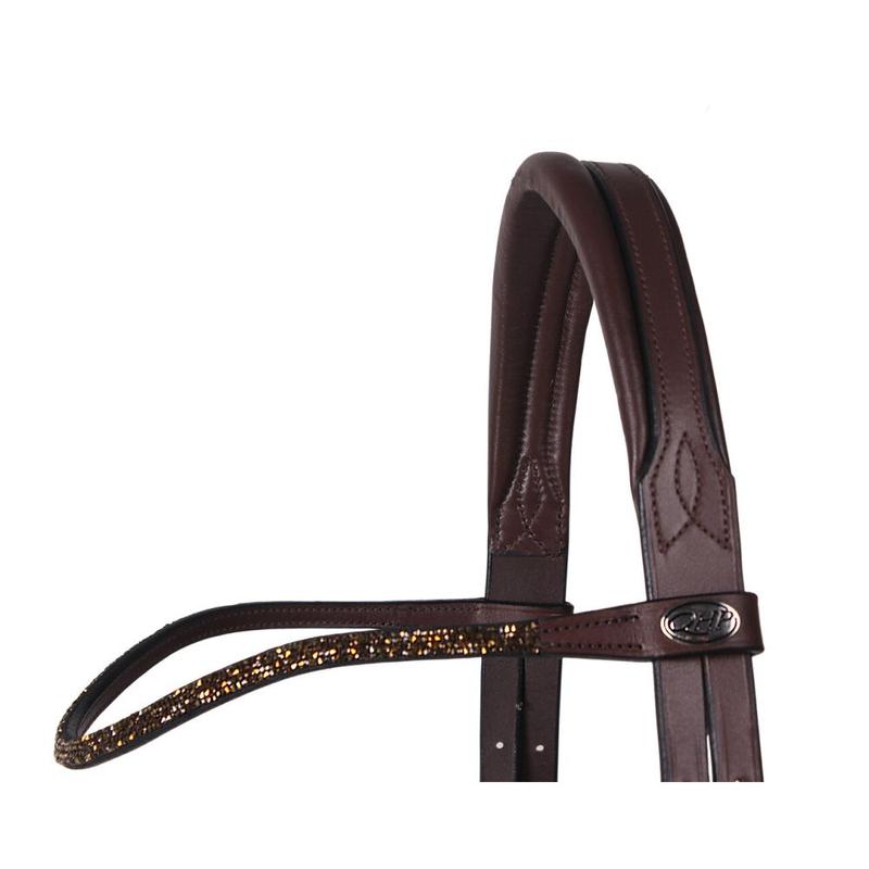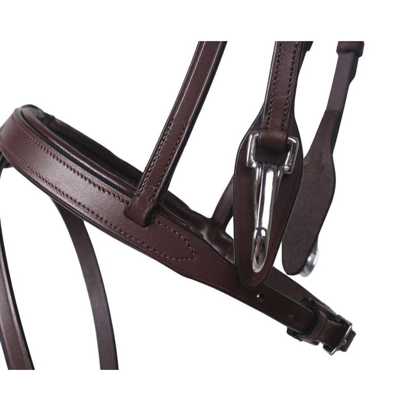 Ogłowie skórzane firmy QHP. Wyścielane miękką skórą przy potylicy i nachrapniku. Wyposażony w karabińczyki do podpięcia wędzidła.