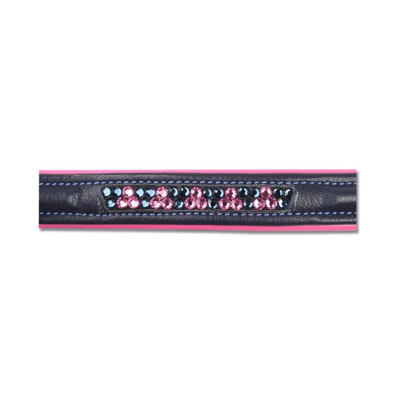 Ogłowie firmy Waldhausen. Ogłowie z nachrapnikiem kombinowanym Unicorn. Całe wykonane z ciemnogranatowego materiału syntetycznego podszytego różowym. Prosty naczółek z ozdobnymi diamencikami na środku. Miękko wyściełany nachrapnik i pasek potyliczny. Ogłowie dedykowane młodym amazonkom i ich kucykom.