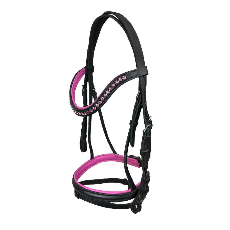 Ogłowie anatomiczne miękko podszyte, wyposażony w 2 naczółki (naczółek ze zwykłej skóry i wąski z kryształkami) oraz profilowany nachrapnik. Okucia ze stali nierdzewnej.