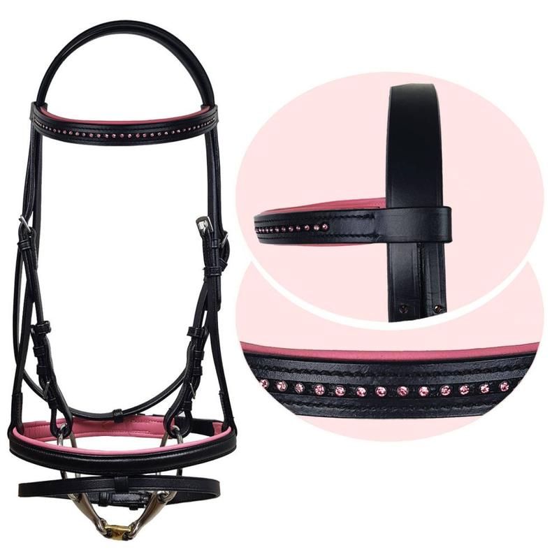 Ogłowie firmy York. Naczółek podszyty różową skórą i ozdobiony różowymi cyrkoniami. W komplecie wodze skórzano-parciane.