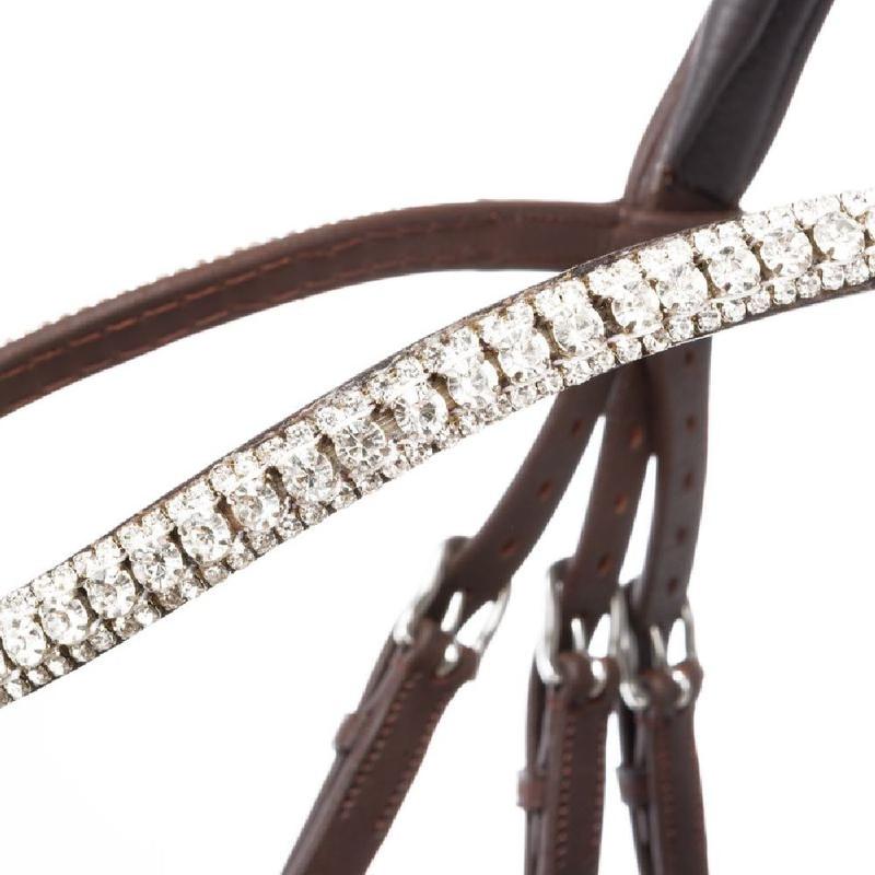 Nachrapnik z eleganckimi skórzanymi elementami po bokach. Naczółek z mniejszymi i większymi cyrkoniami w białym kolorze. Dzięki czemu pod wpływem światła bardzo ładnie się mieni.