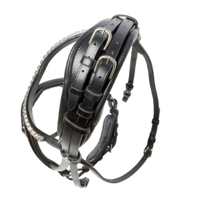 Ogłowie dla małych kucyków oraz szetlandów z lekko zakrzywionym naczółkiem z kryształkami.Dostarczane z wodzami parcianymi.Materiał: skóraMateriał osprzętu: stal nierdzewna, mosiądz