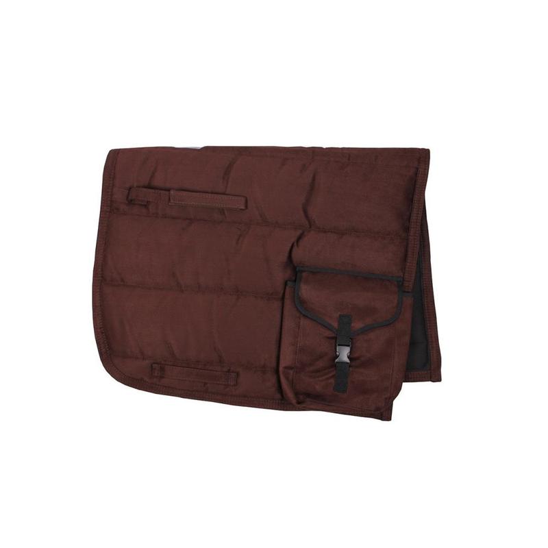 Pad z sakwami Puff firmy QHP. Wykonany z miękkiego, antypoślizgowego zamszu podszytego chłonnym materiałem oraz siatką. Posiada grube wypełnienie. Wyposażony w dwie kieszenie zapinane na zatrzaski oraz rzepy i pętle do popręgu. Idealnie nadaje się do jazdy w terenie.