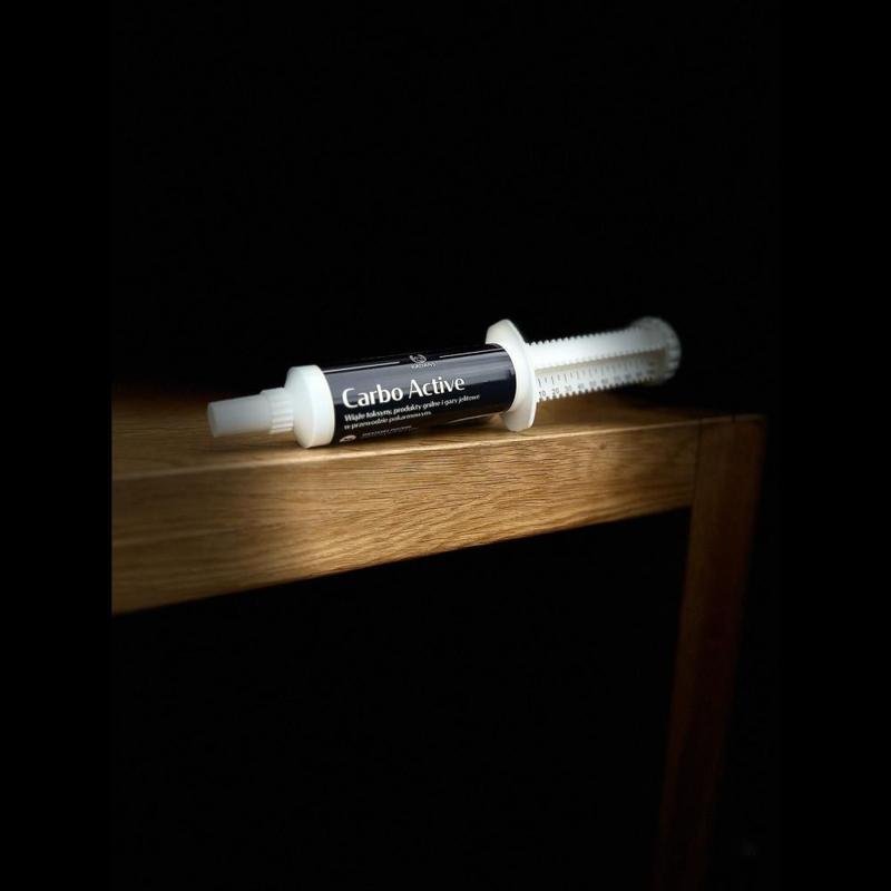 Preparat dla koni i źrębiąt przeznaczony do stosowania podczas biegunki o różnym podłożu w celu ograniczenia ostrych zaburzeń wchłaniania jelitowego. Połączenie węgla oraz bentonitu pozwala na wiązanie niekorzystnych substancji znajdujących się w przewodzie pokarmowym, takich jak toksyny grzybowe, bakteryjne i wirusowe i usuwają je z ogranizmu. Garbniki oraz polifenole występujące w ziołach oraz ekstraktach wykazują działanie łagodzące, ściągające i hamujące rozwój bakterii przyczyniając się do ograniczenia dolegliwości jelitowych, zwiększenia integralności jelit i krztałtowania się prawidłowego stolca. Zawarte w preparacie salicylany wykazują właściwości przeciwzapalne i przeciwbólowe.