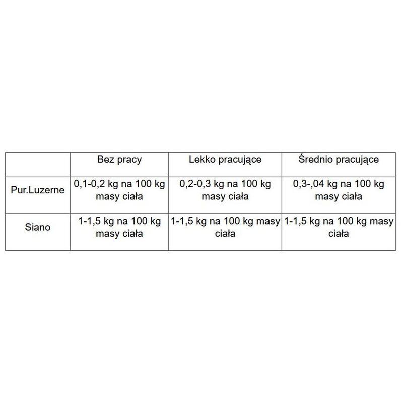 Ma również wysoką zawartość wapnia, co czyni ją idealnym uzupełnieniem racji ziarna zbóż. PUR.LUZERNE może być również użyta jako substytut ziarna ( 1,2 kg lucerny można zastąpić około 1 kg ziarna).