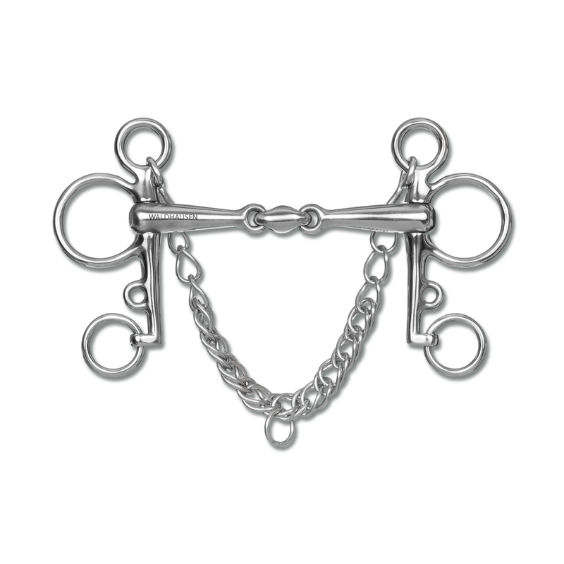 Pelham pojedynczo łamany z łańcuszkiem firmy Waldhausen. Wykonany ze stali nierdzewnej.Grubość ścięgierza: 16 mmDługość czanek: 60 mm.