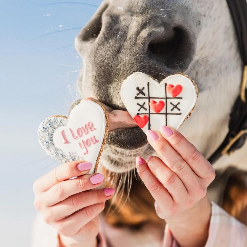 Naturalne smakołyki dla koni w kształcie jeżyka z motywem walentynkowym firmy Końska Cukierenka.