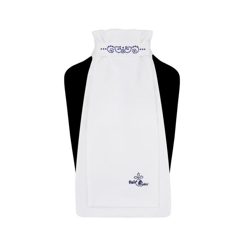 Plastron Amahorse. Plastron z klasycznej białej tkaniny technicznej to niezbędny dodatek w stroju do zawodów ujeżdżeniowych. Niezwykle praktyczny dzięki zapięciu na rzep, ozdobiony jest logo Equestro z wielokolorowych cyrkonii oraz napisem Equestro z tyłu.