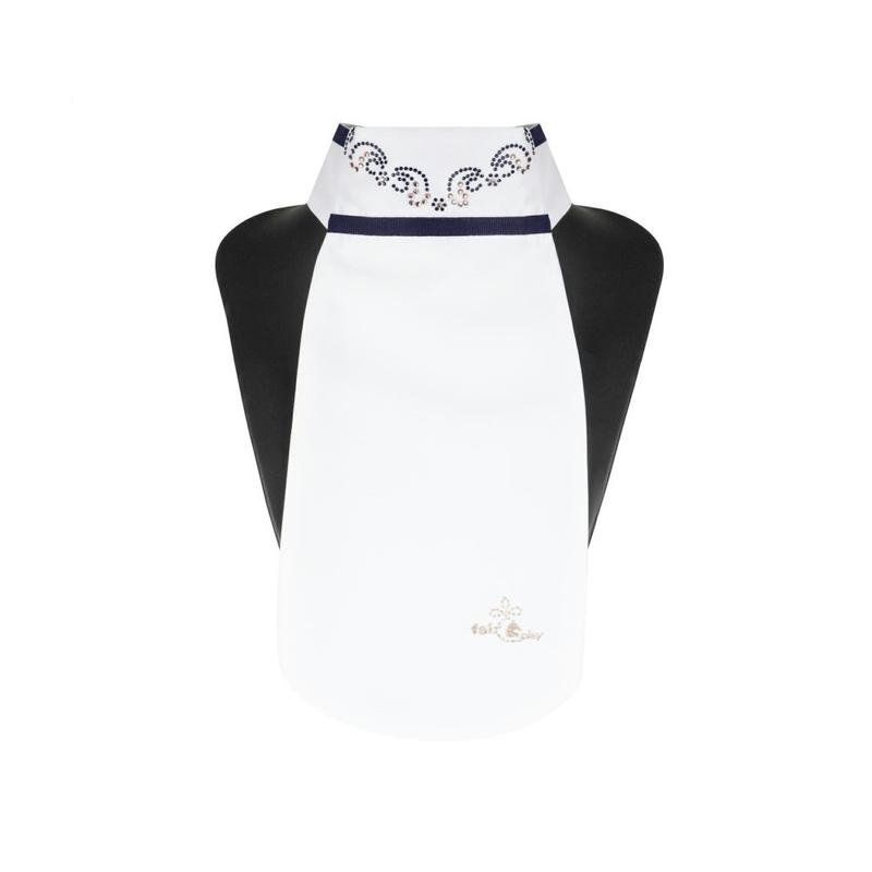 Plastron Amahorse. Plastron z klasycznej białej tkaniny technicznej to niezbędny dodatek w stroju do zawodów ujeżdżeniowych. Niezwykle praktyczny dzięki zapięciu na rzep, ozdobiony jest logo Equestro z wielokolorowych cyrkonii oraz napisem Equestro z tyłu.