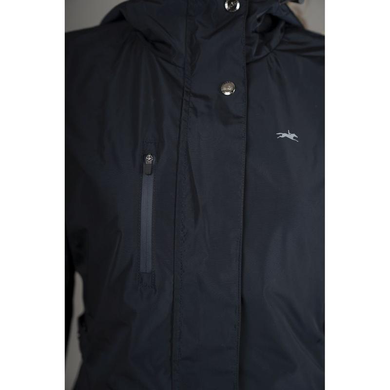 Dwukierunkowy zamek błyskawiczny oraz boczne rozcięcia zwiększają wygodę użytkowania, szczególnie podczas jazdy konnej. Wysoki kołnierz i funkcjonalny kaptur dodatkowo zabezpieczają przed niekorzystnymi warunkami pogodowymi, a praktyczne kieszenie zapinane na zamek pozwalają bezpiecznie przechowywać drobiazgi.
