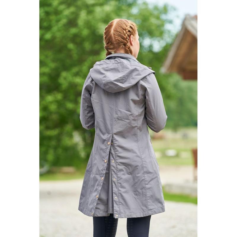 Płaszcz przeciwdeszczowy damski firmy Cavalliero z kolekcji wiosna-lato. Wyposażony w odpinany kaptur, dwukierunkowy zamek błyskaiwczny, rozcięcie jeździeckie z guzikami oraz regulowaną szerokośc rękawów za pomocą zapięcia na rzep. Płaszcz posiada również dwie kieszenie zapinane na suwak i jedną kieszeń wewnętrzną. Ozdobiony na piersi złotym Logo producenta.
