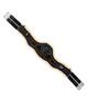 Miękko podszyty popręg ze skóry ze zintegrowaną ochroną. Obie strony elastyczne dla lepszego dopasowania. Ozdobiony kontrastowym haftem. Z solidnym hakiem do wytoku i trzema pierścieniami do mocowania pomocy treningowych. Okucia ze stali nierdzewnej.