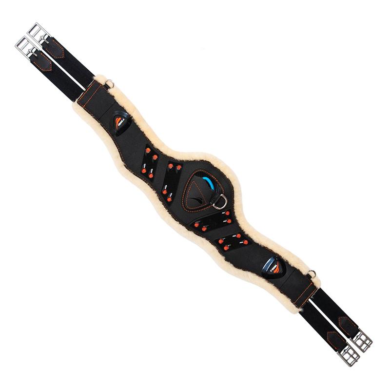Popręg wykonany z miękkiej wysokiej jakości skóry naturalnej z dodatkiem elastanu. Anatomiczny kształt zapewnia optymalne rozłożenie nacisku. Posiada trzywarstwowe, elastyczne gumy oraz sprzączki z nierdzewnej stali po obydwu stronach.