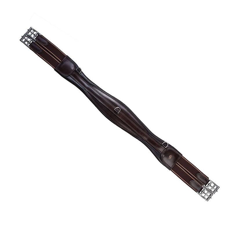 Popręg wykonany z miękkiej wysokiej jakości skóry naturalnej z dodatkiem elastanu. Anatomiczny kształt zapewnia optymalne rozłożenie nacisku. Posiada trzywarstwowe, elastyczne gumy oraz sprzączki z nierdzewnej stali po obydwu stronach.