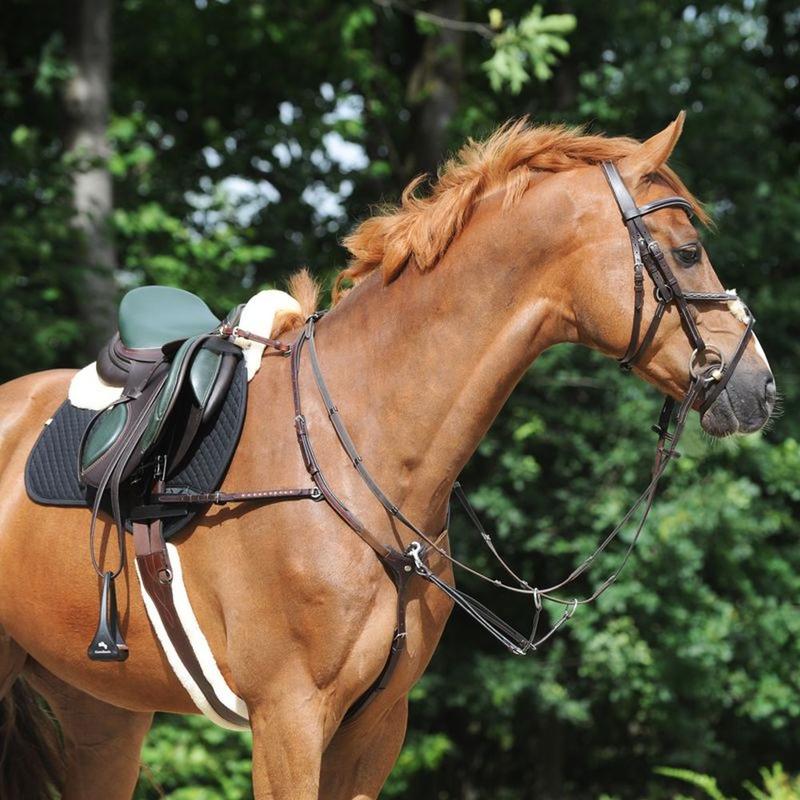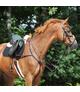 Miękko podszyty popręg ze skóry ze zintegrowaną ochroną. Obie strony elastyczne dla lepszego dopasowania. Ozdobiony kontrastowym haftem. Z solidnym hakiem do wytoku i trzema pierścieniami do mocowania pomocy treningowych. Okucia ze stali nierdzewnej.
