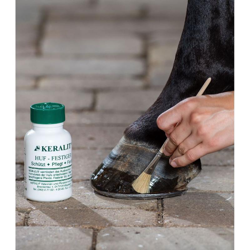 Przed użyciem kopyto oczyścić twardą, suchą szczotką. Najlepszy efekt uzyskuje się stosując KERALIT Hoof Stiger na suche lub tylko lekko wilgotne kopyta, co pozwala na lepsze wchłonięcie się preparatu w róg kopytowy. W przypadku koni niepodkutych preparat nakłada się od zewnątrz na dolną jedną trzecią ściany kopyta i od dołu na krawędź podporową i białą linię. W przypadku koni wrażliwych należy zastosować go również na podeszwę. W przypadku koni podkutych należy nałożyć Keralit na jedną trzecią część ściany kopyta, zdecydownaie nad starymi i nowymi otworami po gwoździach. Gdy koń jest podkuty należy pozwolić, aby płyn trochę spłyną pod podkowę, co znacznie ograniczy proces rozkładu białej linii.