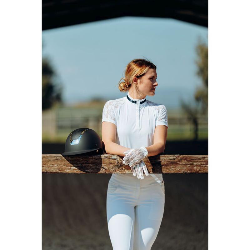 Rękawiczki firmy BR.Część z siateczki zapewniająca lepszą oddychalność. Wzmocnienie dla lepszego trzymania wodzy. Z brokatowym paskiem na przednim szwie. Funkcja dotykowa na kciuku i palcu wskazującym. Zapięcie na rzep z brokatowym materiałem. Materiał: Skóra syntetyczna, Lycra