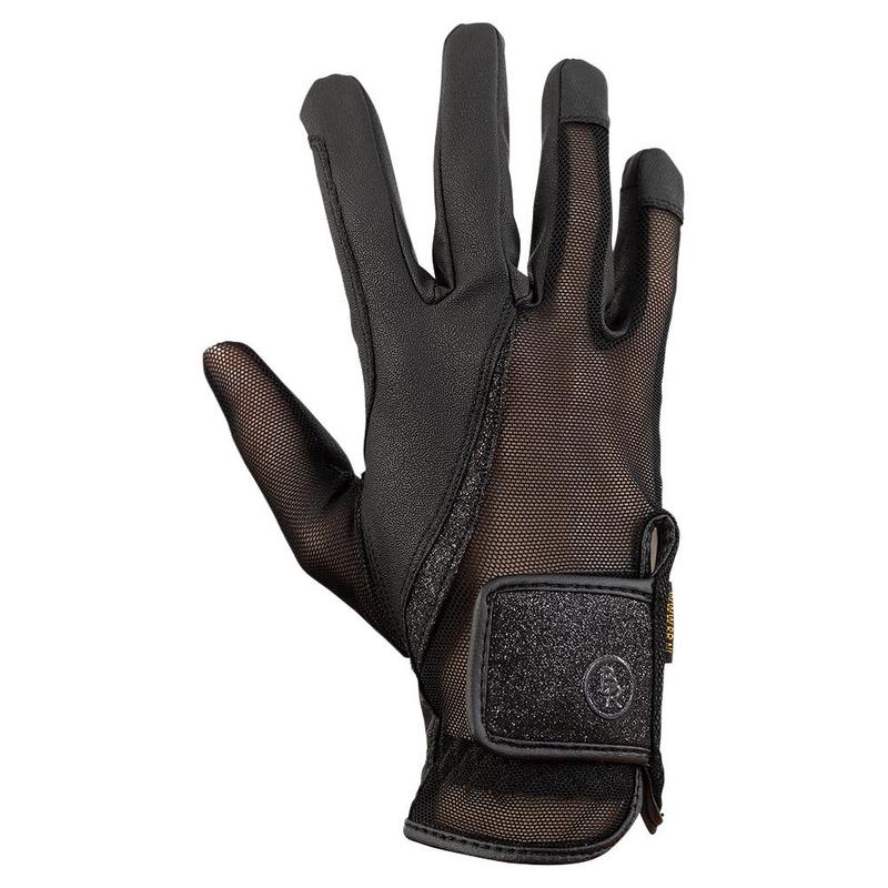 Część z siateczki zapewniająca lepszą oddychalność. Wzmocnienie dla lepszego trzymania wodzy. Z brokatowym paskiem na przednim szwie. Funkcja dotykowa na kciuku i palcu wskazującym. Zapięcie na rzep z brokatowym materiałem.