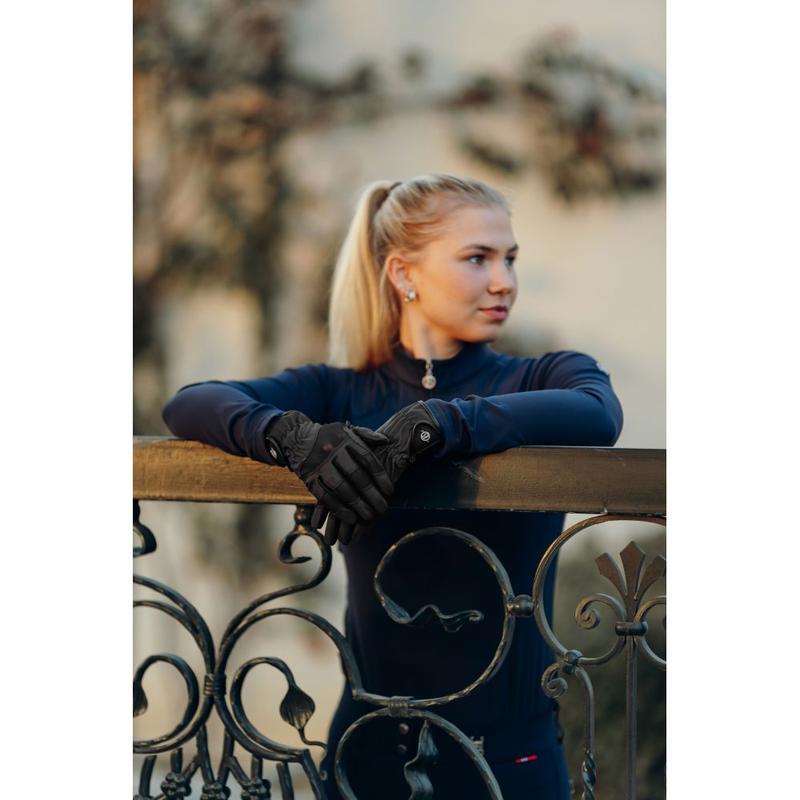 Rękawiczki Roeckl-Grip firmy Roeckl wykonane z ekskluzywnej i oddychającej tkaniny dopasowującej się do dłoni. Zapewniają jednocześnie idealną chwytność co pomaga w posługiwaniu się wodzami. Perfekcyjne wykonanie zawdzięczają starannym cięciom oraz szytym ręcznie detalom. Dodatkowym atutem jest stylowe logo umieszczone na łączniku.