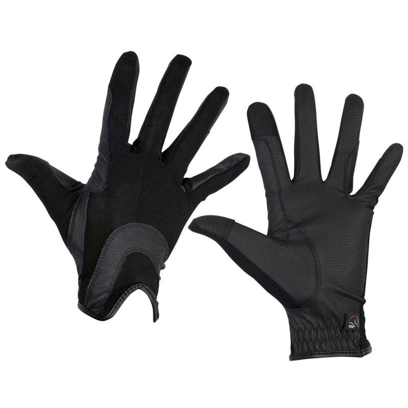Letnie rękawiczki firmy HKM. Posiadają naszywki touch screen. Zewnętrzna strona wykonana z elastycznej siateczki, natomiast wnętrze z materiału typu grip, który nie ślizga się na wodzach i jest paroprzepuszczalny.