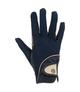Rękawiczki zimowe wykonane z tkaniny Polartec. Dobrze utrzymują ciepło, są oddychające i rozciągliwe. Błyskawicznie odprowadzają wilgoć, są odporne na ścieranie i zachowują swój kształt. Ozdobione złotymi nadrukami. Cała wewnętrzna strona dłoni pokryta jest silikonowym wzorem ułatwiającym trzymanie wodzy. Idealny wybór na zimowe treningi.