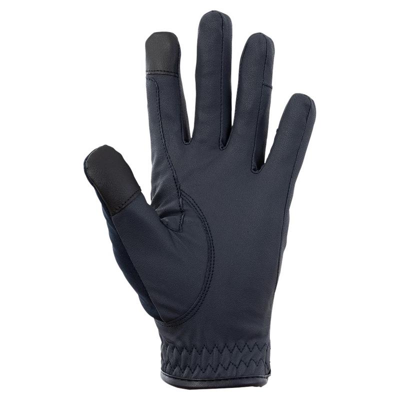 Rękawiczki zimowe wykonane z tkaniny Polartec. Dobrze utrzymują ciepło, są oddychające i rozciągliwe. Błyskawicznie odprowadzają wilgoć, są odporne na ścieranie i zachowują swój kształt. Ozdobione złotymi nadrukami. Cała wewnętrzna strona dłoni pokryta jest silikonowym wzorem ułatwiającym trzymanie wodzy. Idealny wybór na zimowe treningi.