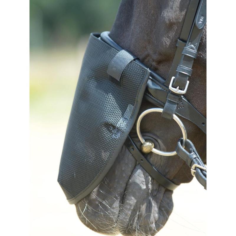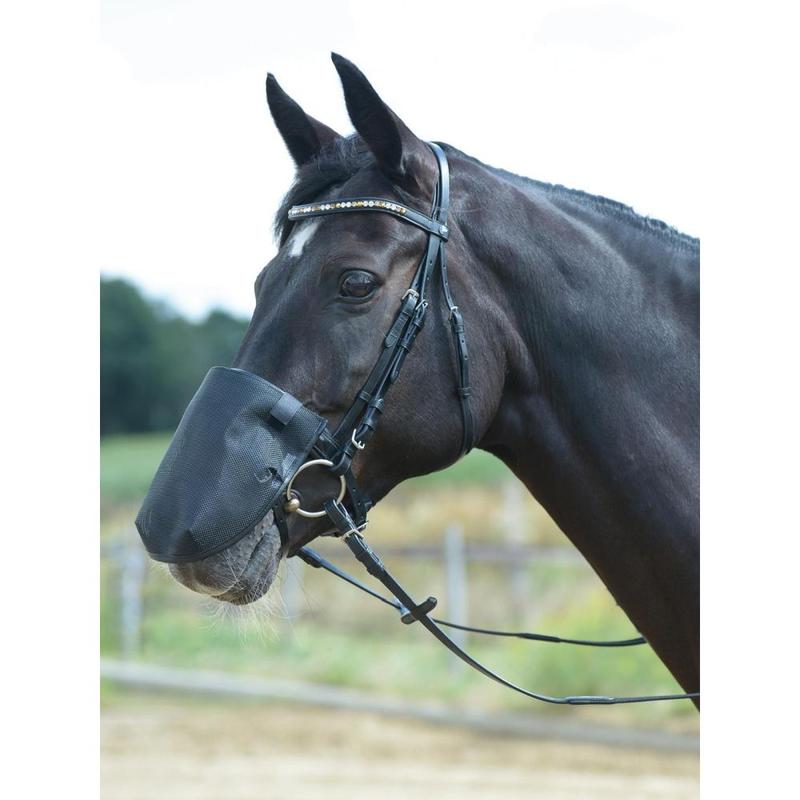 Siatka na chrapy firmy Busse. Siatka na chrapy o wszechstronnym zastosowaniu, zmniejszająca objawy potrząsania głową, poparzenia słonecznego w obszarze chrapów i ogólnej nadwrażliwości na owady. Nachrapnik można normalnie zapiąć, ponieważ siatka leży na zewnątrz na pasku nosowym.