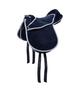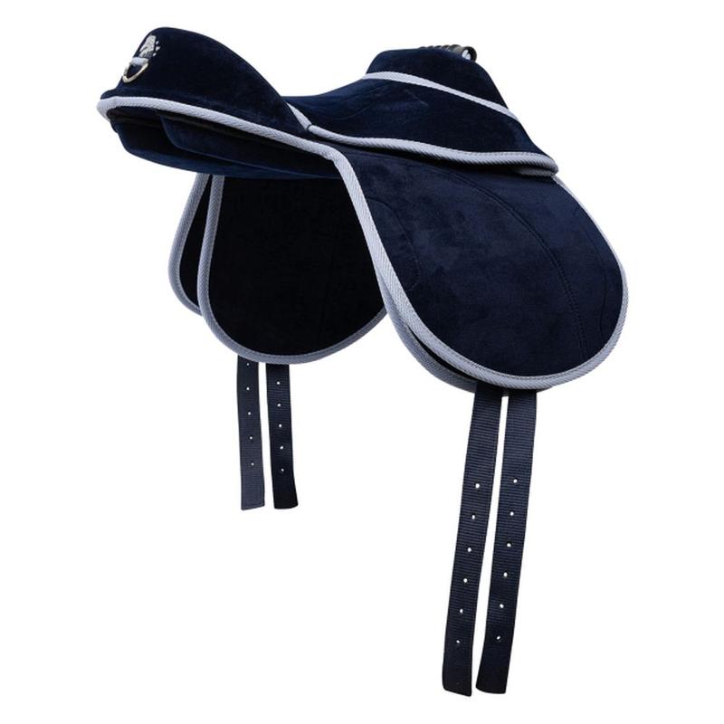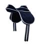 Siodło z wełny owczej z firmy HKM. Wierzch i spód wykonane z owczej wełny. Wyposażone we wkłady filcowe oraz zaczepy do puślisk. Długość całkowita 60 cm, szerokość całkowita 100 cm, rozmiar siedziska 28 cm (mierzone wewnątrz).