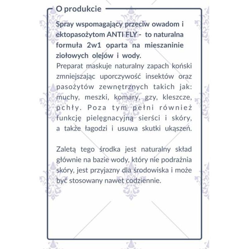 Preparat przeciw owadom Fly Guard Spray firmy Black Horse.Produkt ten maskuje nieprzyjemny zapach końskiego potu, który wabi owady.Łagodzi świąd po ukąszeniach owadów. Przeznaczony do źrebiąt, jak również koni dorosłych. Nie powoduje przebarwień sierści. Uwaga! Zaleca sie, aby spryskać małą powierzchnie skóry, aby wykluczyć wystąpienie uczulenia na...