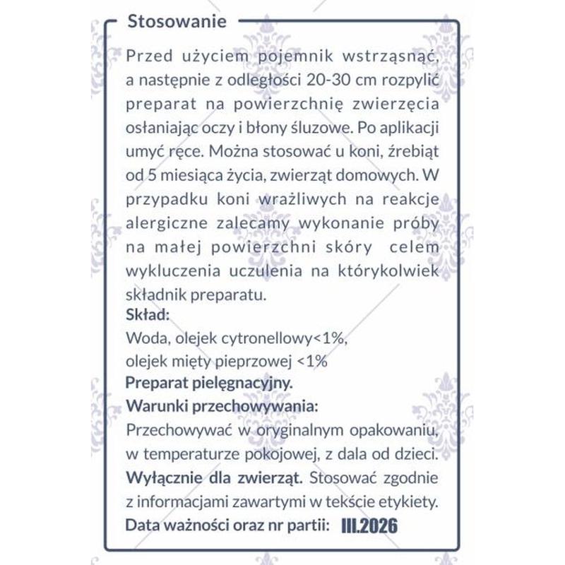 Preparat przeciw owadom Citronella Shield firmy Jumpit. Preparat wspomagający ochronę przed insektami: - wspomaga ochronę przed owadami - zawiera naturalne olejki eteryczne - zwiększa trwałość i skuteczność- pozostawia sierść miękką, błyszczącą i zadbaną. NIE ZAWIERA SUBSTANCJI DOPINGUJĄCYCHSposób użycia:Spryskać kilkukrotnie partie ciała narażone na...