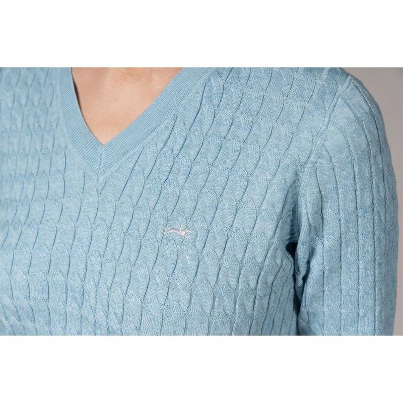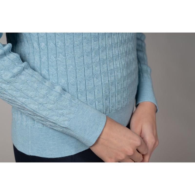 Damski sweter SPPam Style ma klasyczny dekolt w serek i ponadczasowy splot warkoczowy. Subtelny haft z logo konia na piersi dodaje stylowego akcentu, podkreślając wysoką jakość tego swetra – idealnego dla jeźdźców dbających o modę.