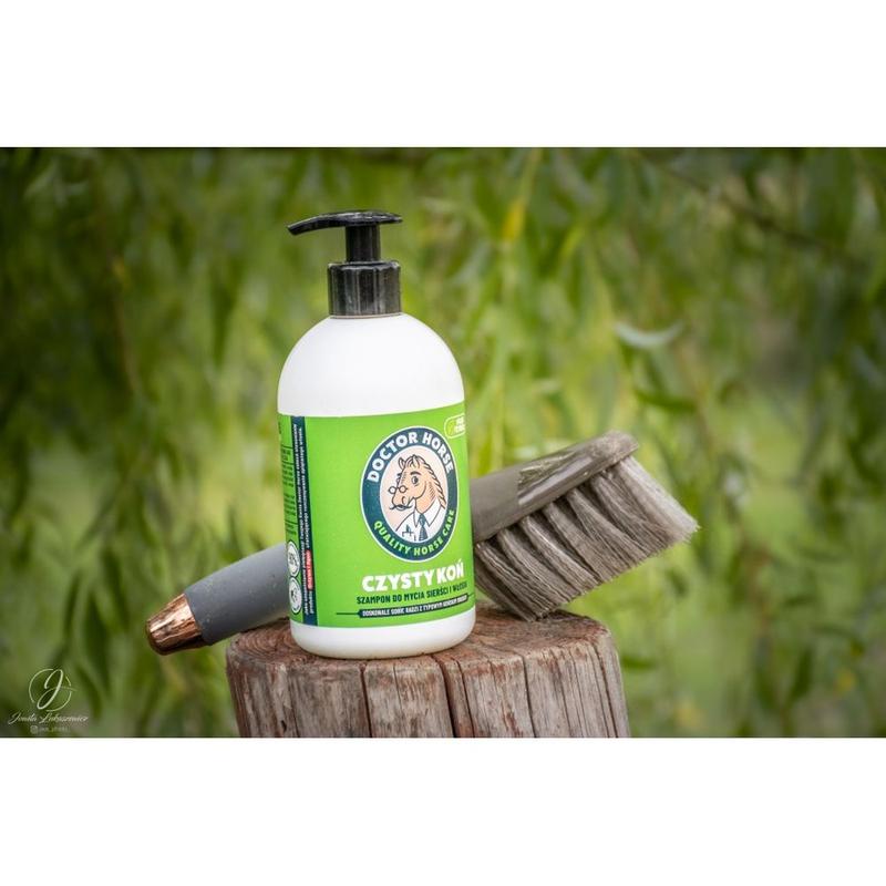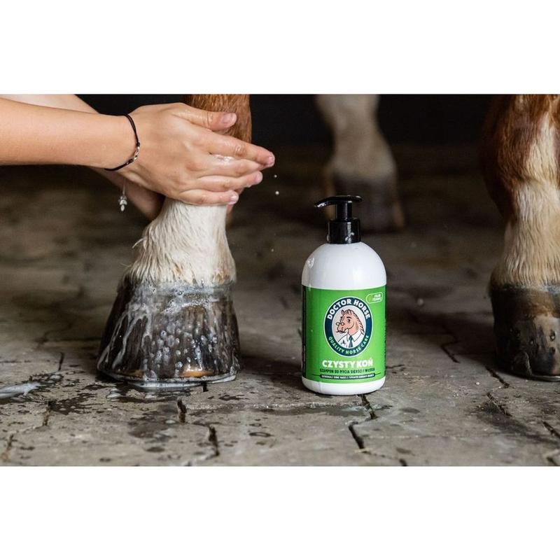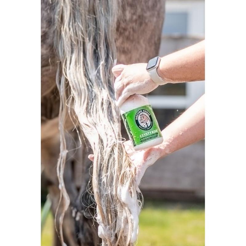 Wegański szampon Doctor Horse. Łagodny ale skuteczny - opracowany z myślą o delikatnej skórze koni, dzięki czemu nie powoduje podrażnień ani przesuszenia. Po kąpieli sierść jest czysta, miękka i jedwabiście błyszcząca, a włosie łatwiejsze do rozczesania.