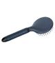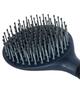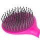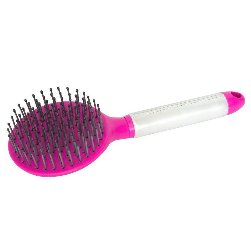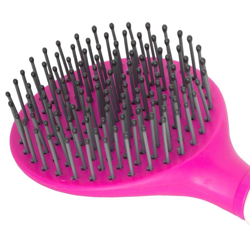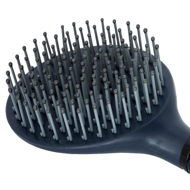 Szczotka wyposażona jest w elastyczne, zaokrąglone końcówki włosia, które delikatnie rozplątują włosy, minimalizując ryzyko ich uszkodzenia lub wyrwania. Długi uchwyt szczotki umożliwia łatwy chwyt, co jest szczególnie ważne podczas długotrwałego użytkowania, a otwór na końcu uchwytu ułatwia wygodne przechowywanie.