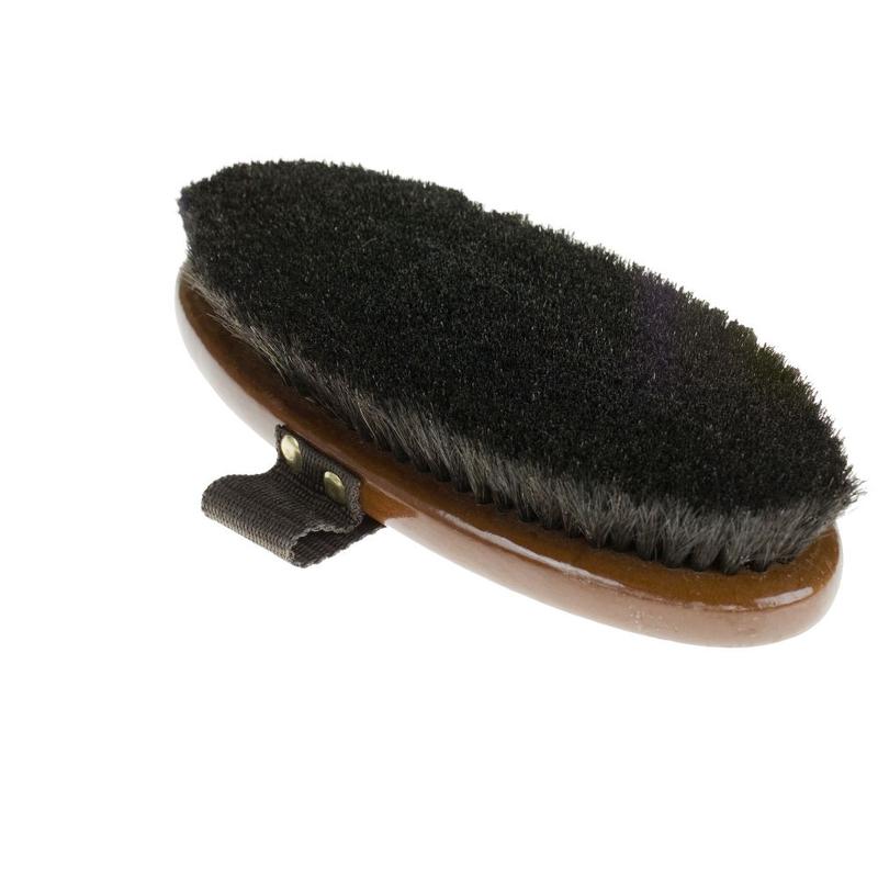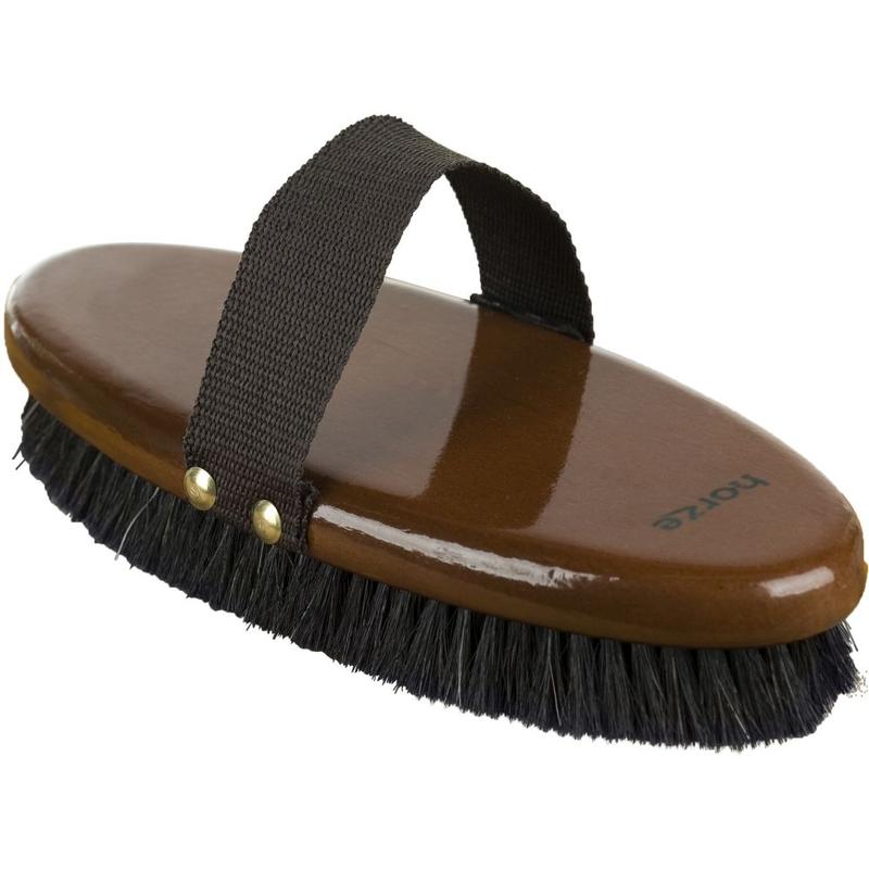 Szczotka drewniana, owalna Horze. Świetnie dopasowana, duża szczotka wyprodukowana z naturalnego, średnio twardego włosia końskiego. Wyposażona w lakierowaną, wzmocnioną rękojeść która ułatwia szczotkowanie. Idealna do usuwania zabrudzeń zgromadzonych w okolicy popręgu. Długość ok. 21cm.